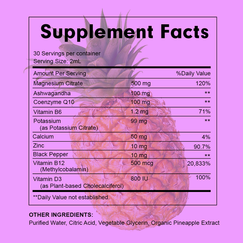 クエン酸マグネシウム、アシュワガンダ、コエンザイムQ10、ビタミンB6、カリウム、カルシウム、亜鉛、黒胡椒、ビタミンB12、ビタミンD3